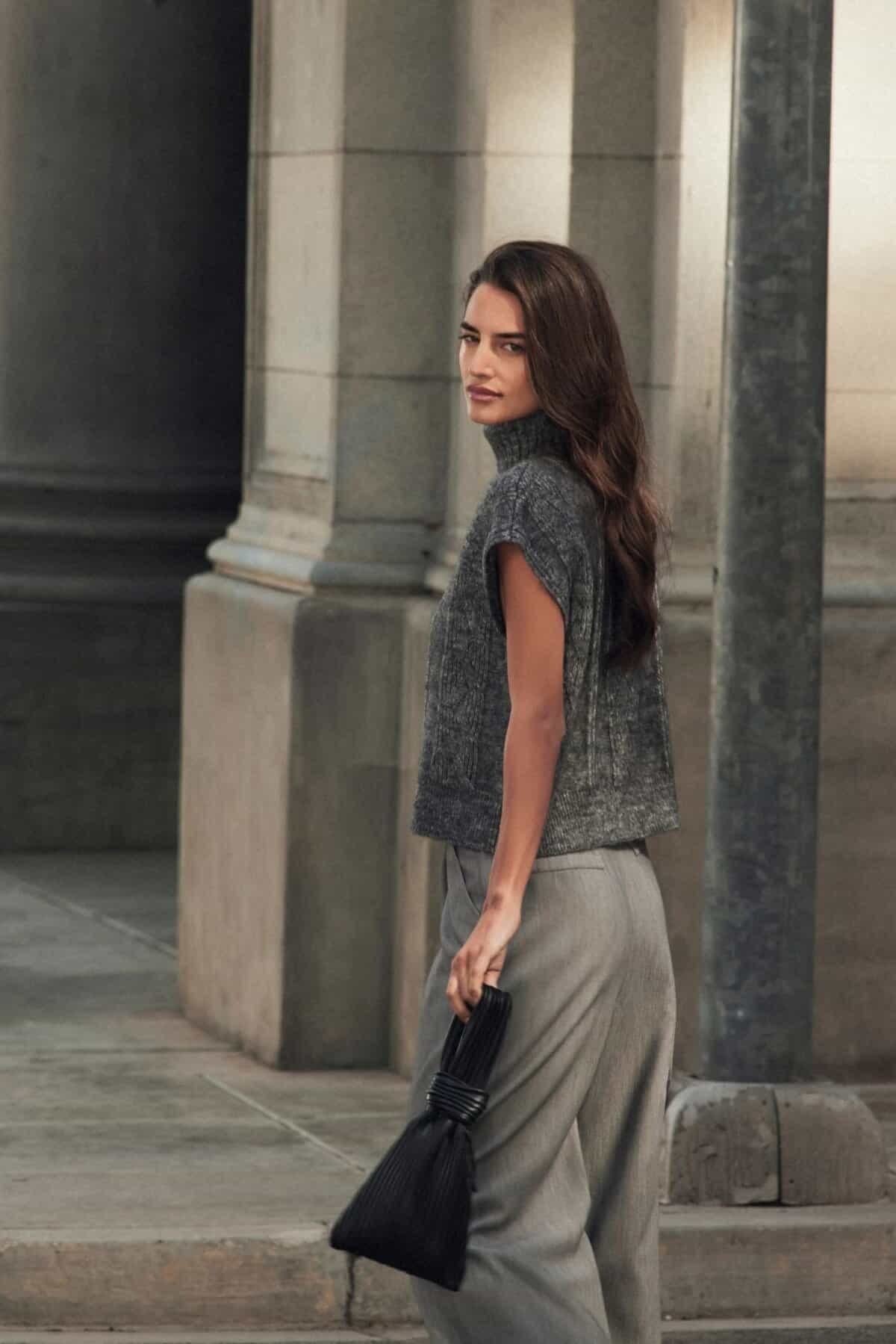 This ensemble epitomizes the timeless elegance of old money style with its refined simplicity and quality materials. The short-sleeved gray turtleneck sweater exudes sophistication while offering a modern twist on a classic piece.