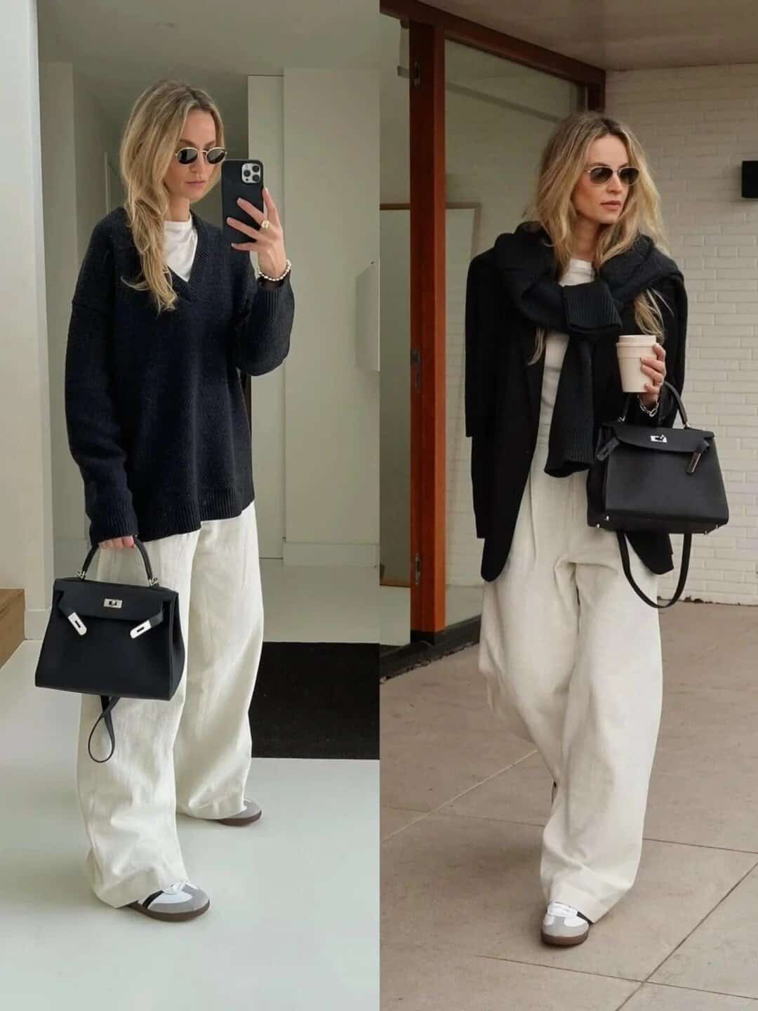 Wide-leg cream trousers add a touch of relaxed refinement, while the iconic black Herms Birkin bag serves as the perfect accessory, instantly elevating the entire outfit. Subtle yet statement-making oval sunglasses complete the look, exuding an air of mystery and exclusivity.