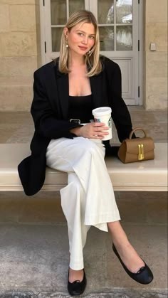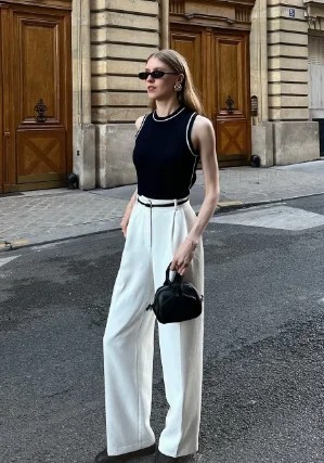 This outfit exemplifies the timeless elegance of old money style with a modern twist. The sleek black sleeveless top paired with crisp white wide-leg trousers creates a striking monochrome contrast that exudes sophistication.