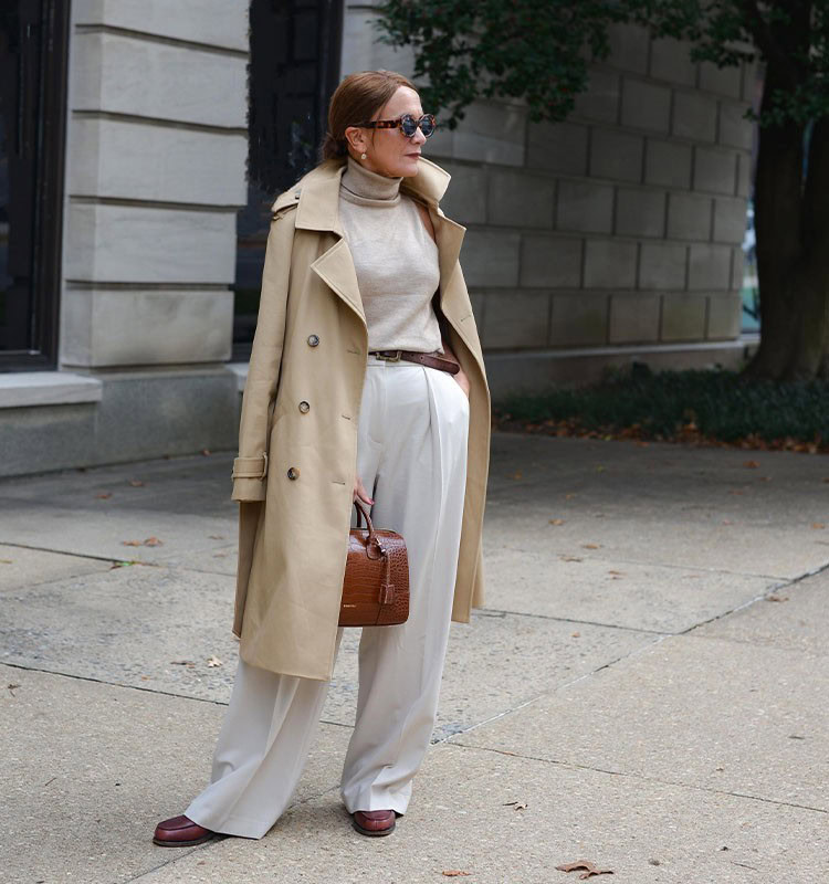 This ensemble epitomizes the timeless old money aesthetic, perfect for elevating your campus style. The camel trench coat, a staple of preppy elegance, drapes gracefully over a cream turtleneck and crisp white wide-leg trousers.