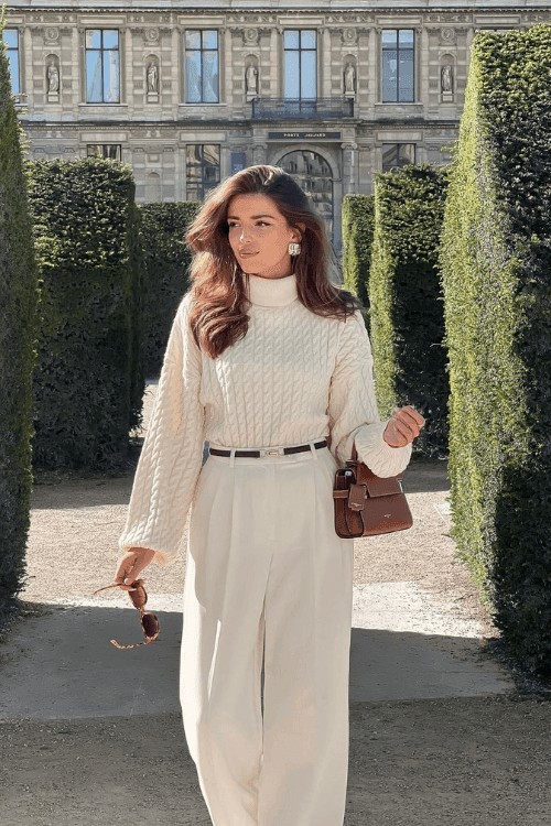 Paired with crisp white trousers, the monochromatic palette exudes understated luxury. The outfit is cinched with a brown leather belt, introducing a touch of contrast and structure.