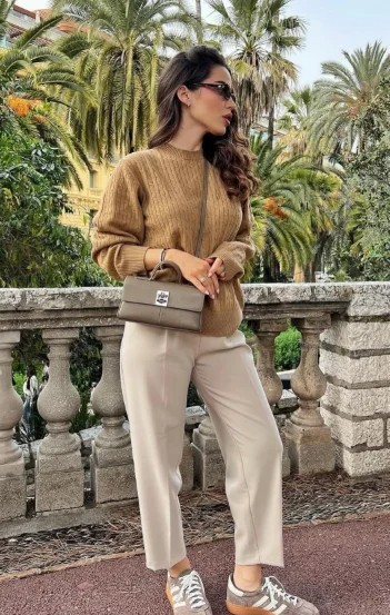 This ensemble exemplifies the timeless elegance of old money style, perfect for a sophisticated campus look. The camel-colored ribbed sweater exudes warmth and refinement, while the cream wide-leg trousers offer a relaxed yet polished silhouette.
