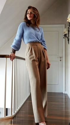 This ensemble epitomizes the refined yet comfortable aesthetic of old money school style. The light blue ribbed sweater with voluminous balloon sleeves adds a touch of femininity and sophistication, while the high-waisted beige trousers exude classic elegance.