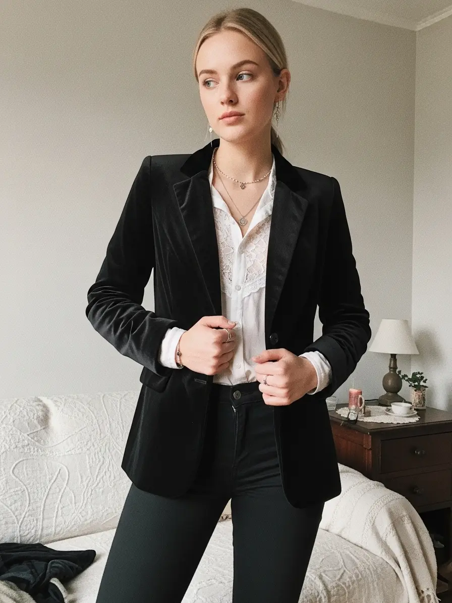 The velvet blazer adds a touch of luxury, while the lace shirt underneath brings in classic Gothic romance.