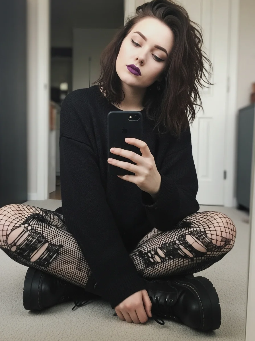 This outfit balances comfort with classic Goth style.