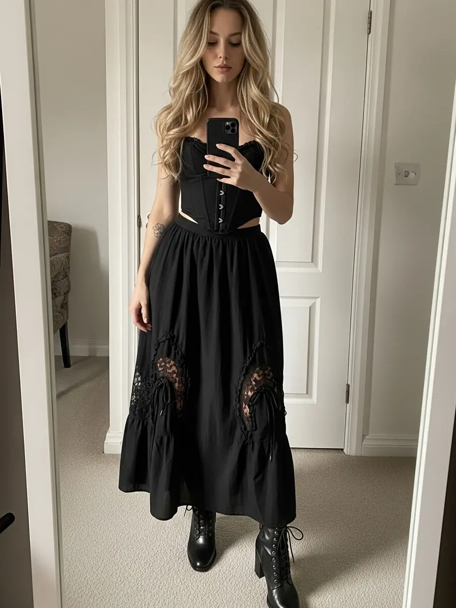 This outfit beautifully combines Victorian elegance with Gothic sensuality.