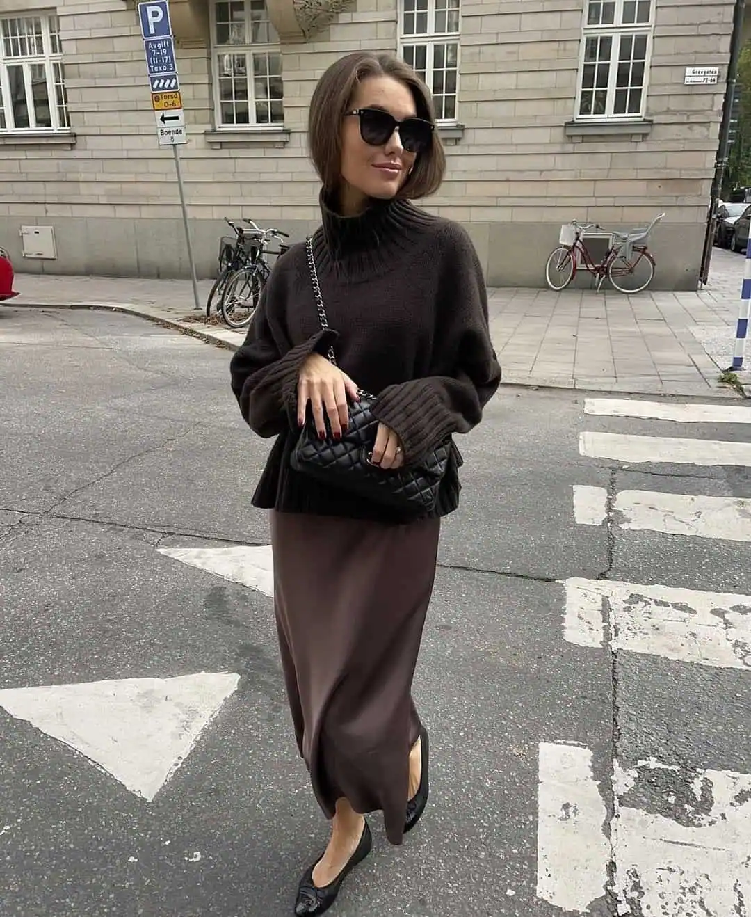 Elevate your campus style with this sophisticated monochromatic ensemble that exudes cool confidence. The oversized chocolate brown turtleneck sweater paired with a sleek maxi skirt creates a streamlined silhouette thats both comfortable and fashion-forward.