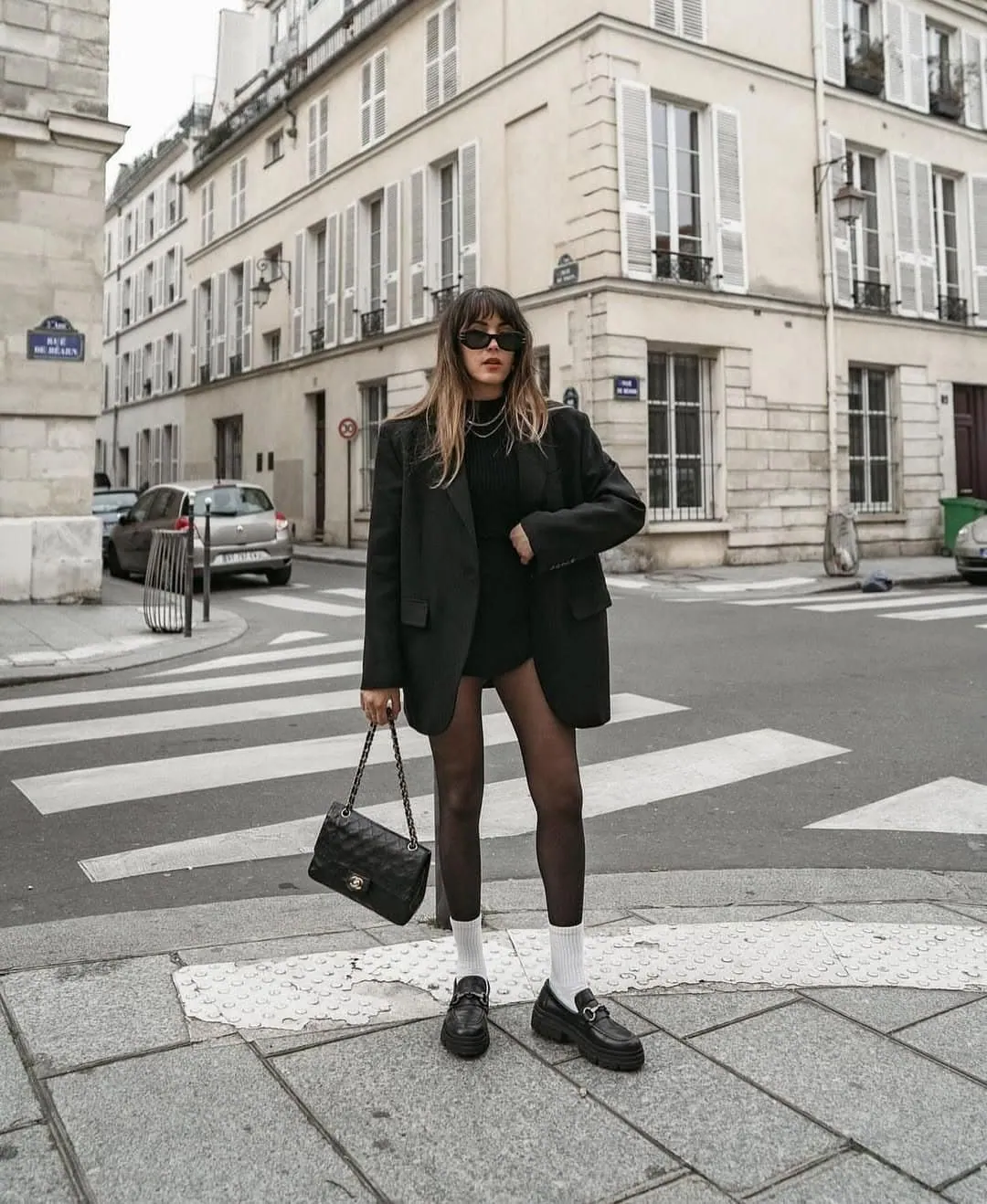 Elevate the look with sheer tights and chunky loafers, adding a touch of edgy comfort. The iconic quilted handbag and slim sunglasses complete this effortlessly cool outfit, ensuring youll turn heads on campus.