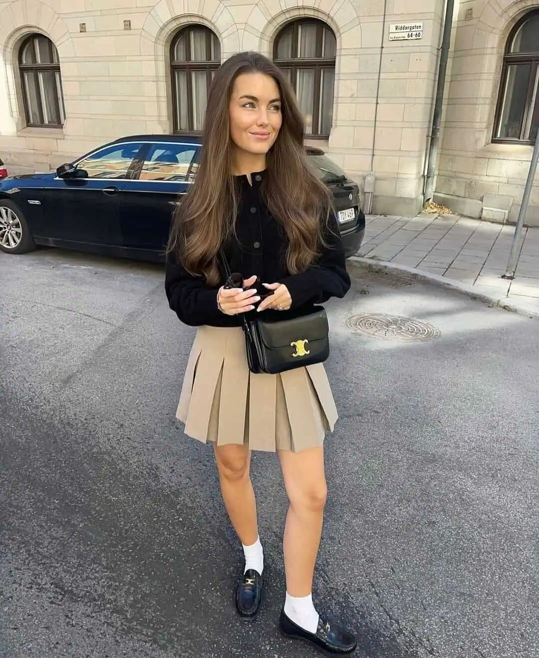 Elevate your campus style with this timeless preppy ensemble that seamlessly blends comfort and sophistication. The outfit features a chic black cardigan paired with a beige pleated skirt, creating a perfect balance of classic and contemporary.