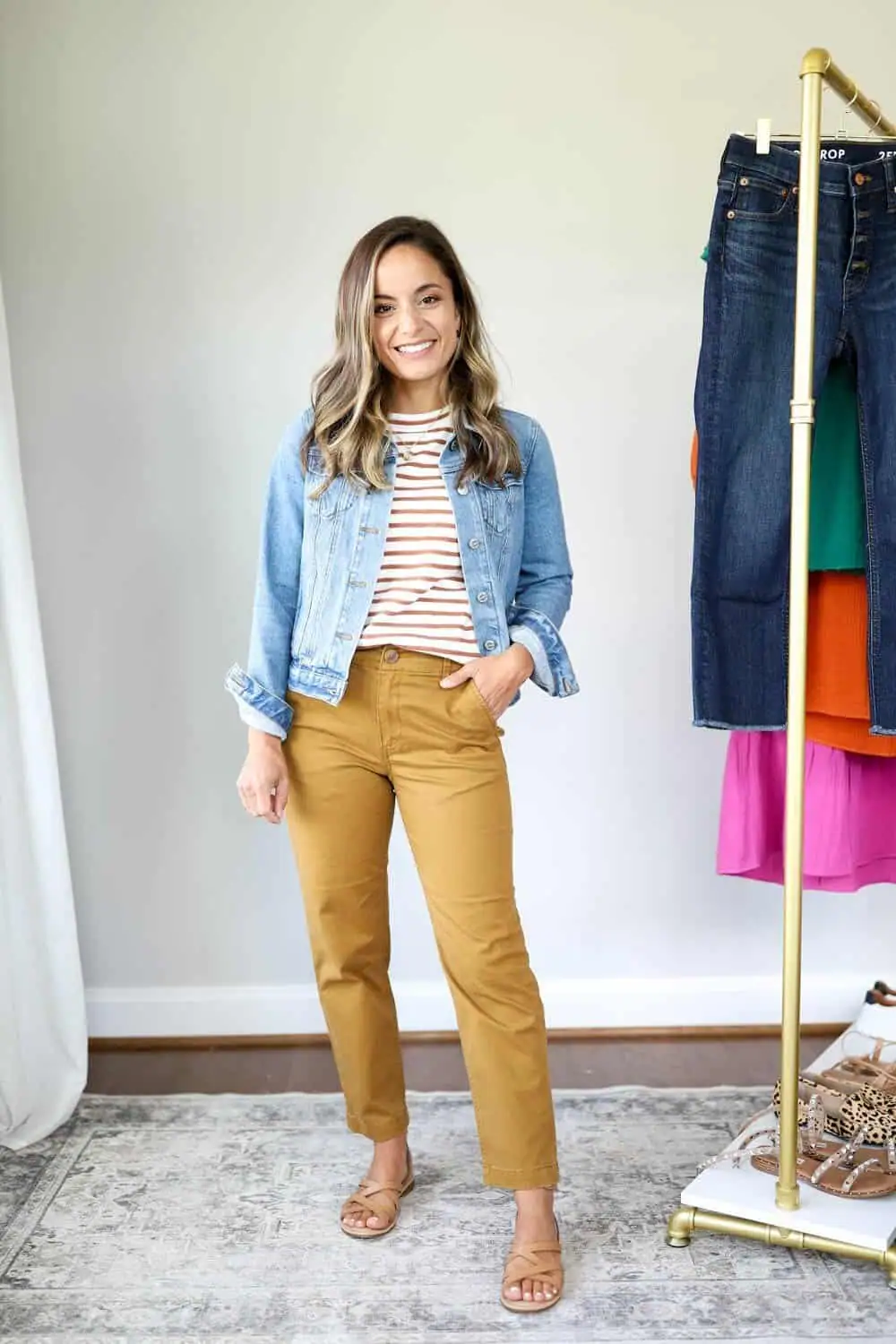 Elevate your campus style with this effortlessly cool ensemble that combines classic elements with a modern twist. The light-wash denim jacket paired with a striped tee creates a timeless look thats perfect for back-to-school.