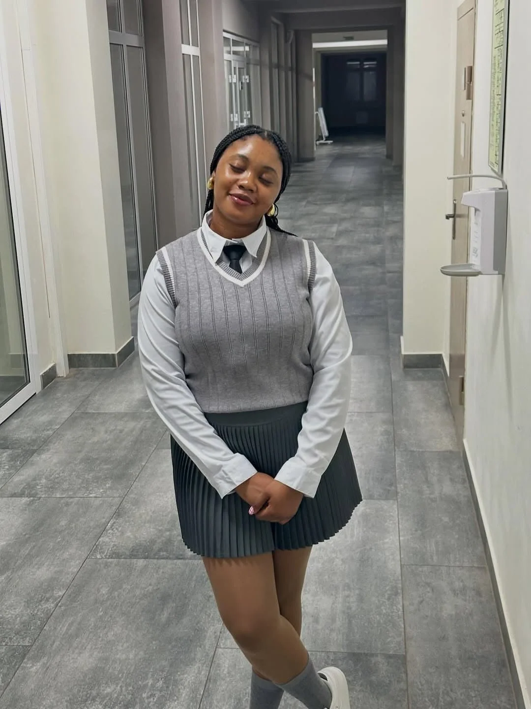 The addition of a slim black tie adds a touch of academic polish, while the combination of knee-high socks and white sneakers keeps the look youthful and campus-appropriate. This versatile outfit strikes the perfect balance between smart and casual, making it ideal for transitioning from lectures to social activities.