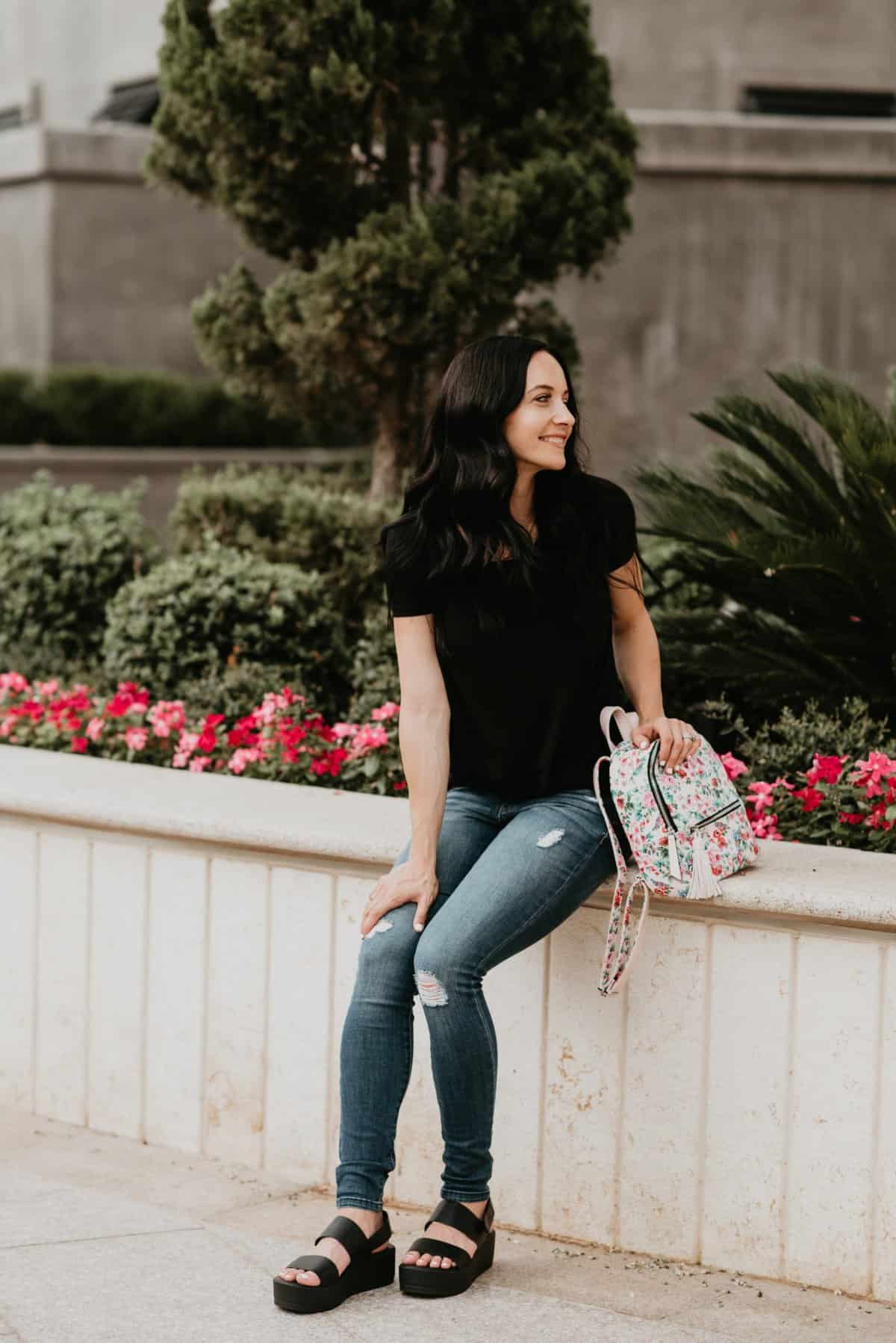 What elevates this look is the eye-catching floral backpack, adding a pop of personality and freshness to the overall style. The chunky black platform sandals offer both comfort and height, perfect for navigating busy campus walkways.