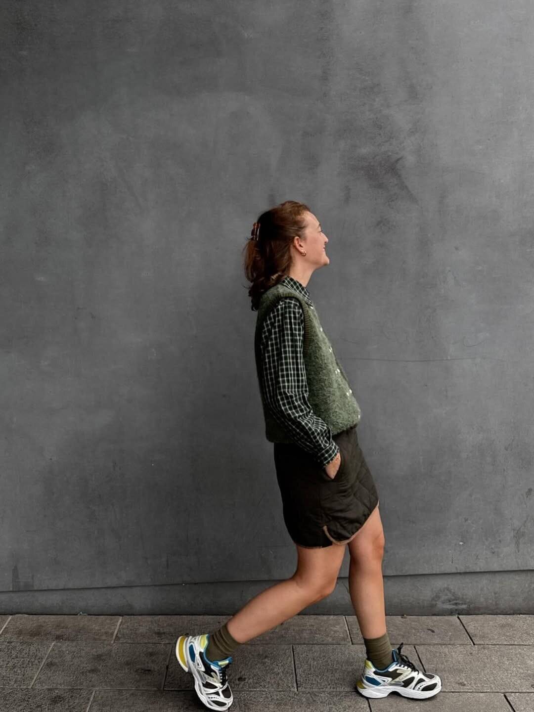 This outfit effortlessly blends preppy, grunge, and sporty elements to create a unique back-to-school look. The plaid shirt layered under a cozy green vest adds a touch of academic charm, while the black mini skirt keeps things edgy and contemporary.