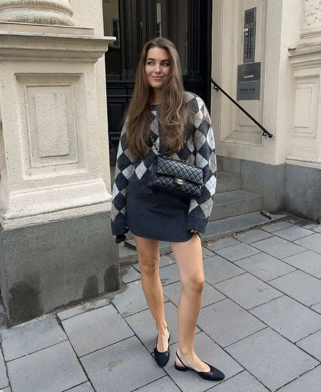 Paired with a sleek charcoal mini skirt, this outfit strikes the perfect balance between comfort and fashion-forward thinking. The addition of classic black ballet flats and a quilted designer handbag adds a touch of sophistication, making this ensemble suitable for both lectures and social gatherings.