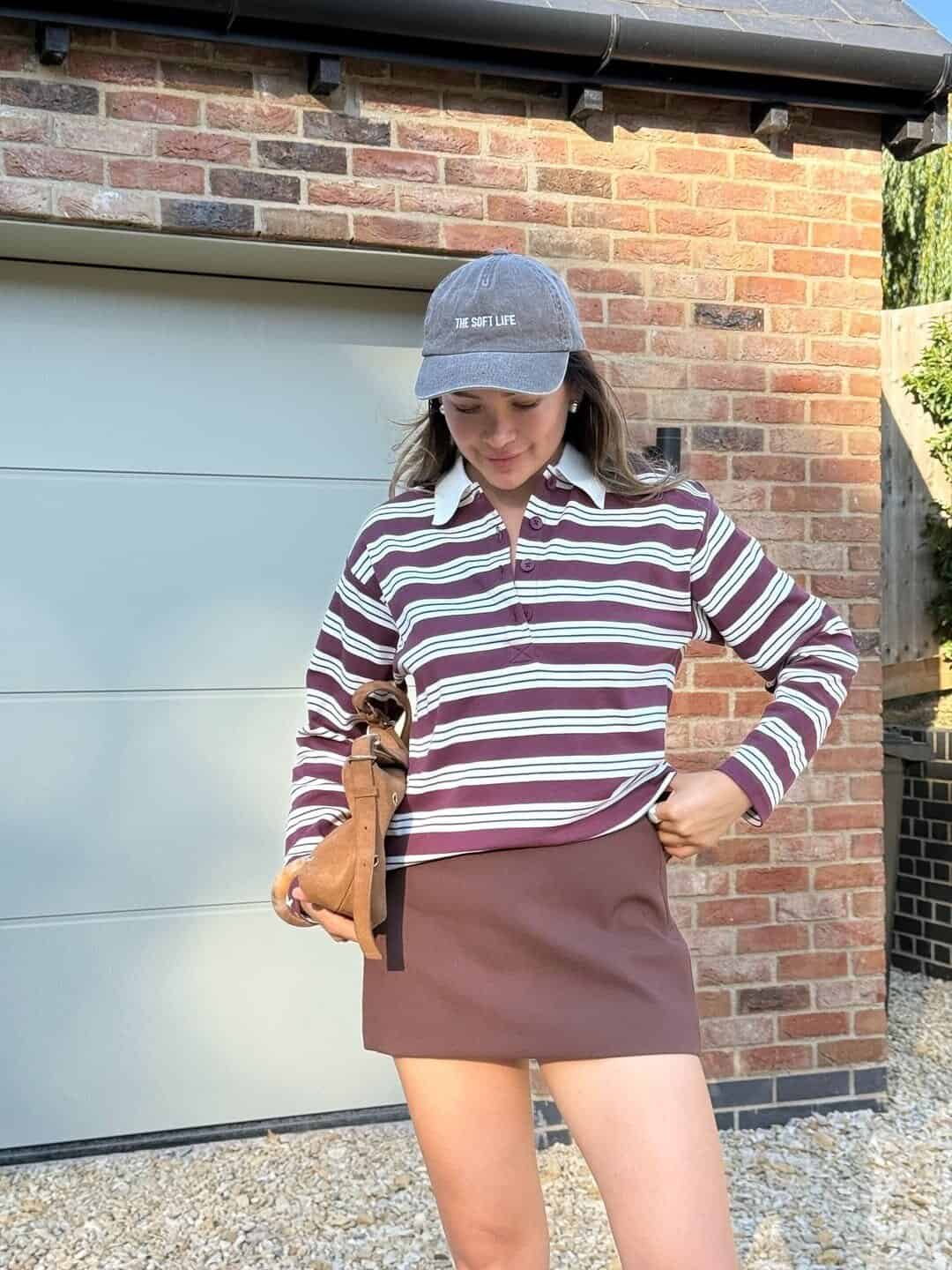 Make a bold statement on campus with this trendsetting ensemble that perfectly blends vintage vibes with modern flair. The burgundy and white striped long-sleeve polo shirt exudes a casual yet put-together look, while the matching mini skirt creates a cohesive and stylish silhouette.