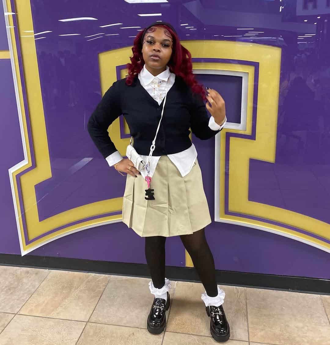 The outfit is elevated by bold accessories, including patent leather platform loafers adorned with frilly white socks, and a unique pendant necklace. The vibrant red hair adds a pop of color and personality, showcasing how students can infuse their individual style into traditional school wear.