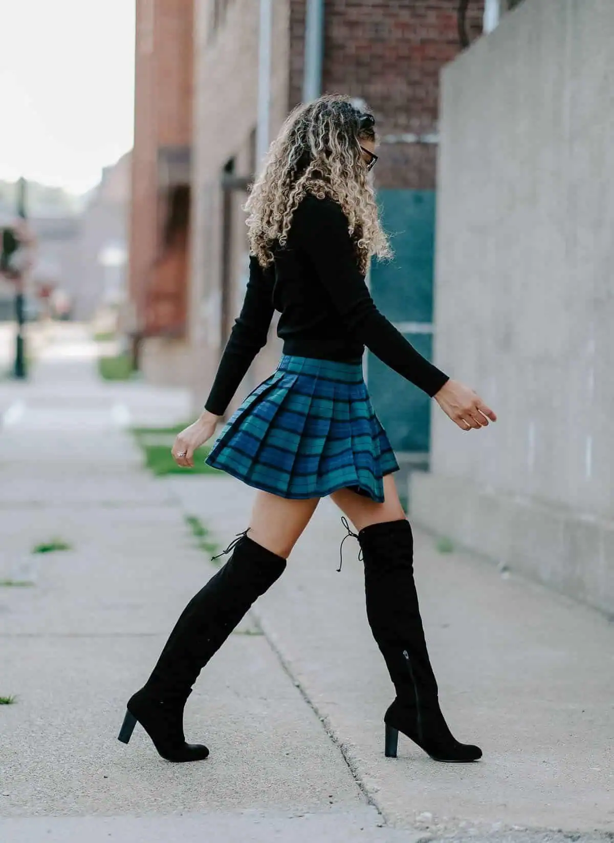 Make a bold statement on campus with this chic combination of a vibrant plaid skirt and sleek over-the-knee boots. The teal and blue plaid pattern adds a pop of color to the classic black ensemble, creating a perfect balance between preppy and edgy.