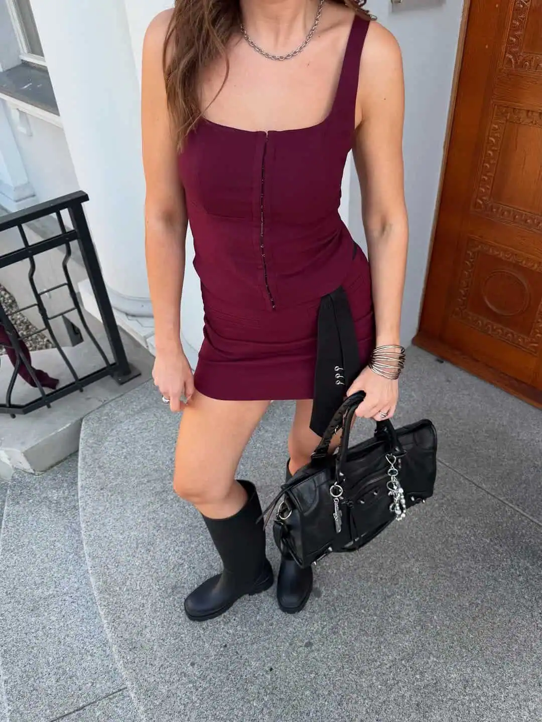Make a bold statement on campus with this figure-hugging burgundy bodycon dress paired with edgy black knee-high boots. The rich wine hue of the dress exudes sophistication, while the sleek silhouette shows off your curves with confidence.