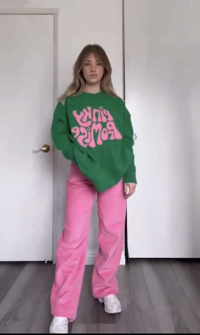 Make a statement on campus with this eye-catching color-block ensemble that perfectly balances comfort and style. The oversized green sweatshirt featuring a quirky pink graphic adds a playful touch, while the wide-leg pink trousers create a striking contrast.