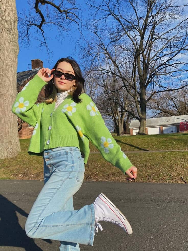 Make a statement this fall with a vibrant lime green cardigan adorned with cheerful daisy motifs. This eye-catching piece pairs perfectly with light wash, high-waisted jeans for a trendy ’90s-inspired look.