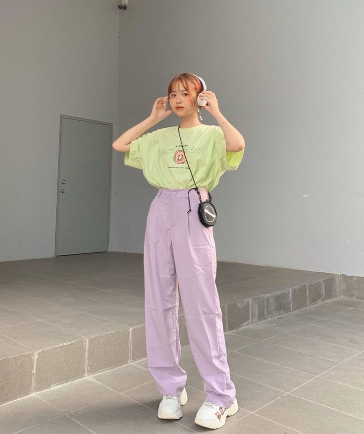 Make a statement with this eye-catching pastel ensemble that’s perfect for fall. The oversized lime green graphic tee paired with high-waisted lavender trousers creates a fresh and modern look that’s sure to turn heads in the hallways.