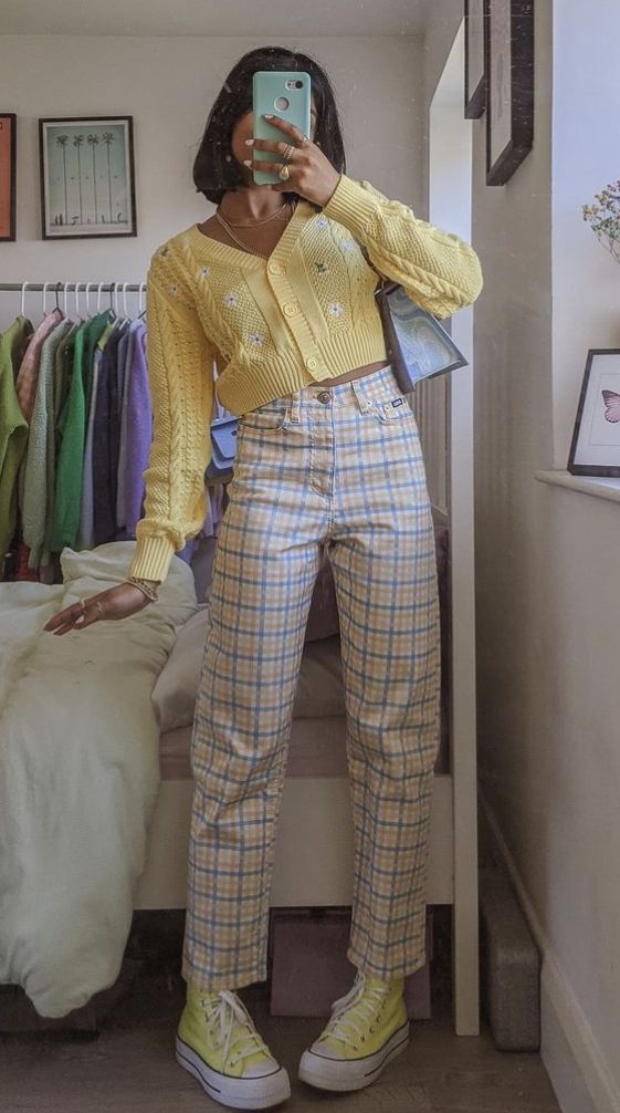 Embrace a charming vintage-inspired look that’s perfect for fall with this eye-catching ensemble. The cropped yellow cardigan with delicate floral embroidery adds a touch of sweetness, while the high-waisted plaid trousers bring a cool, retro vibe.