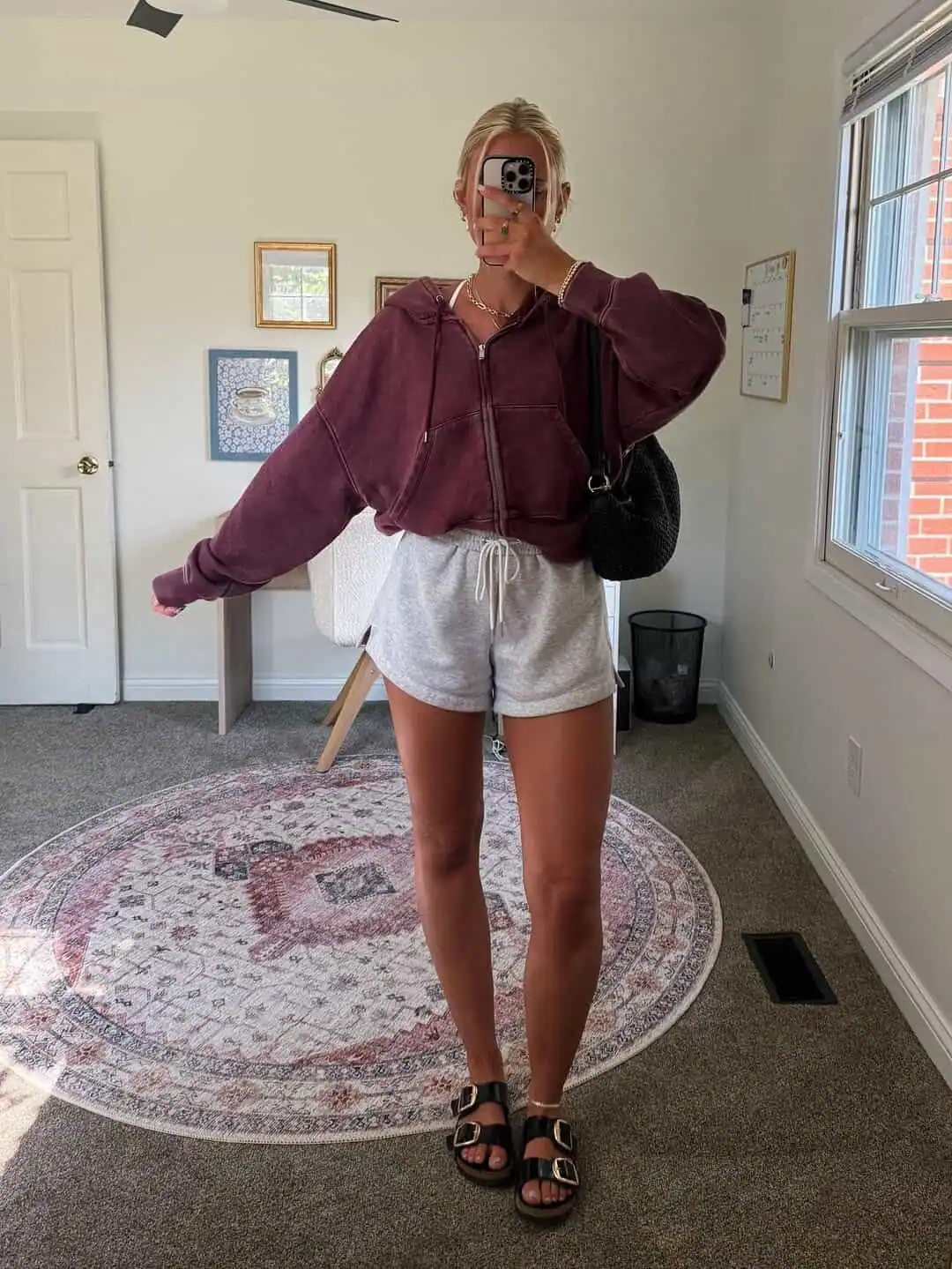 Strike the perfect balance between comfort and style with this trendsetting outfit. The burgundy zip-up hoodie paired with light gray shorts creates a laid-back yet put-together look thats ideal for navigating your first day on campus.