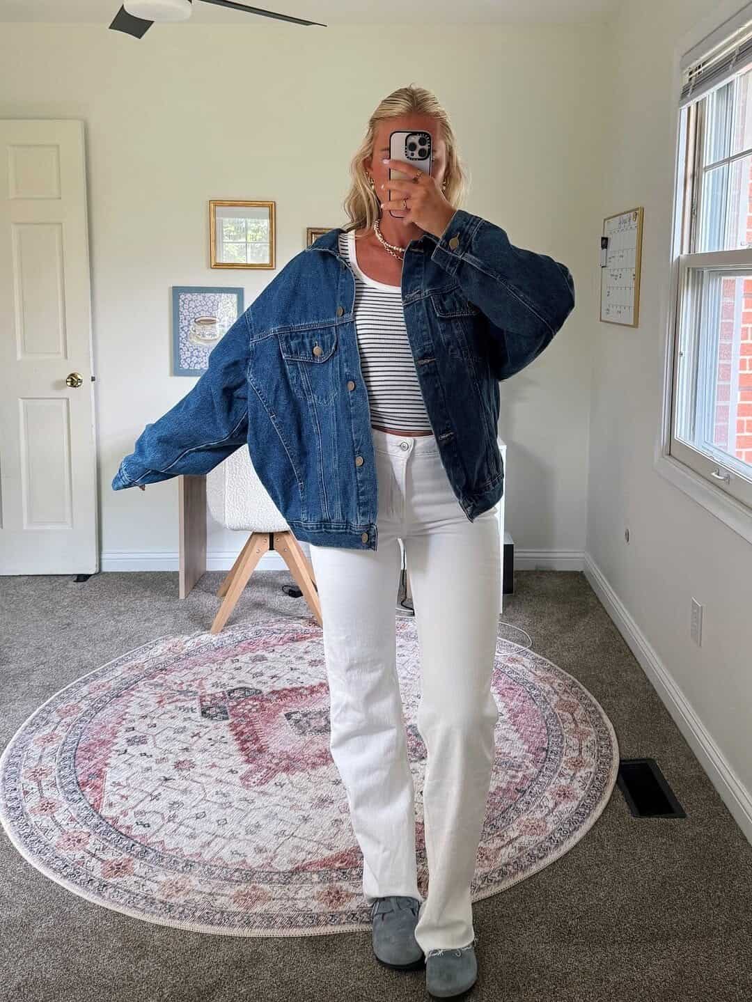 Make a timeless statement on your first day with this effortlessly chic ensemble. The oversized denim jacket paired with crisp white jeans creates a perfect balance of casual cool and polished sophistication.