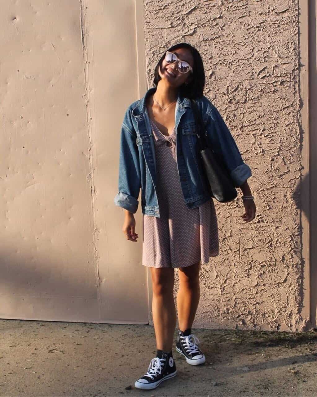 Make a stylish entrance on your first day with this effortlessly cool ensemble. The combination of a soft, feminine polka dot dress and an oversized denim jacket creates the perfect balance of comfort and style.