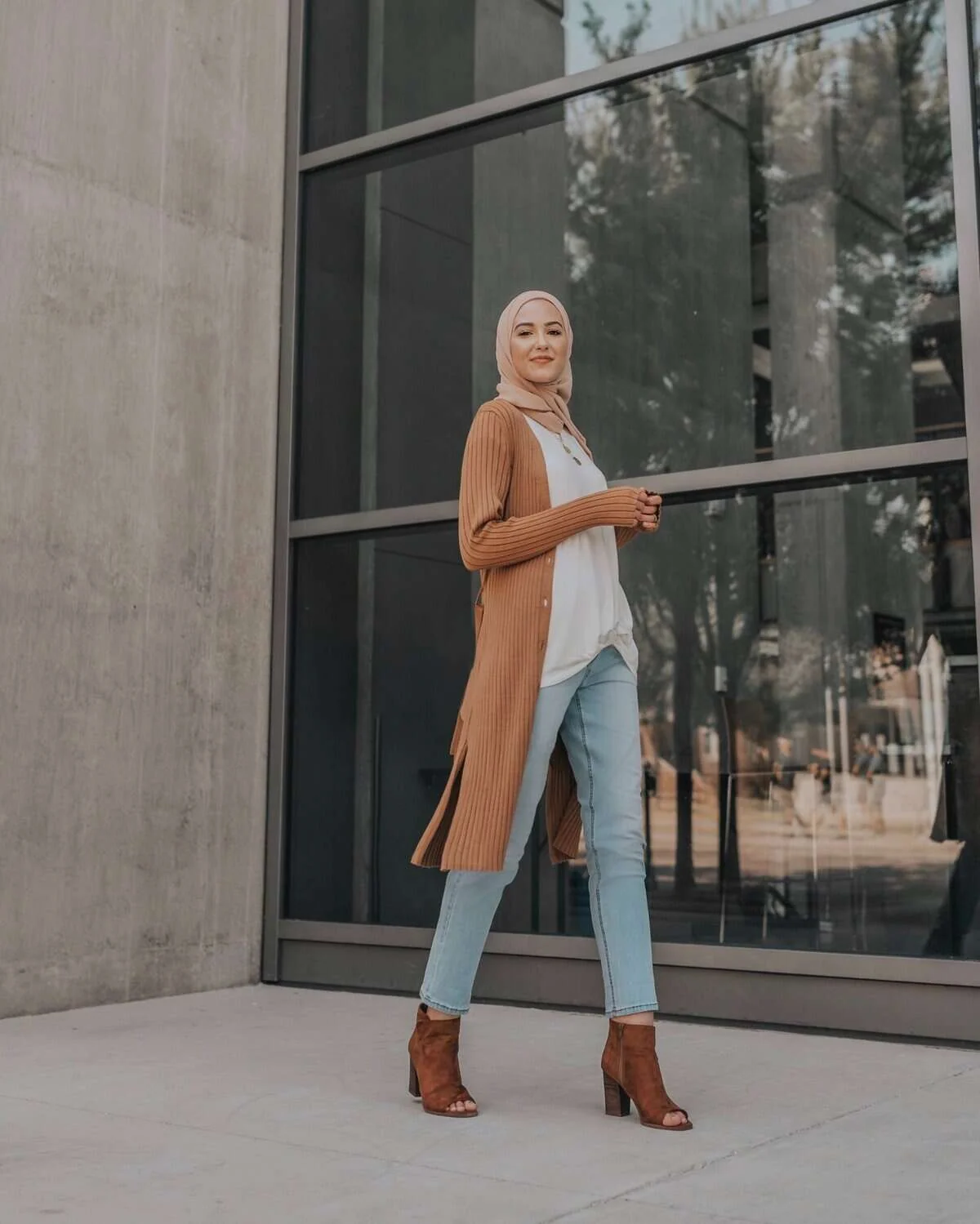 Make a stylish yet modest entrance with this trendsetting ensemble that masterfully combines comfort and fashion. The long, caramel-colored ribbed cardigan adds a touch of sophistication while providing warmth for those cool campus mornings.