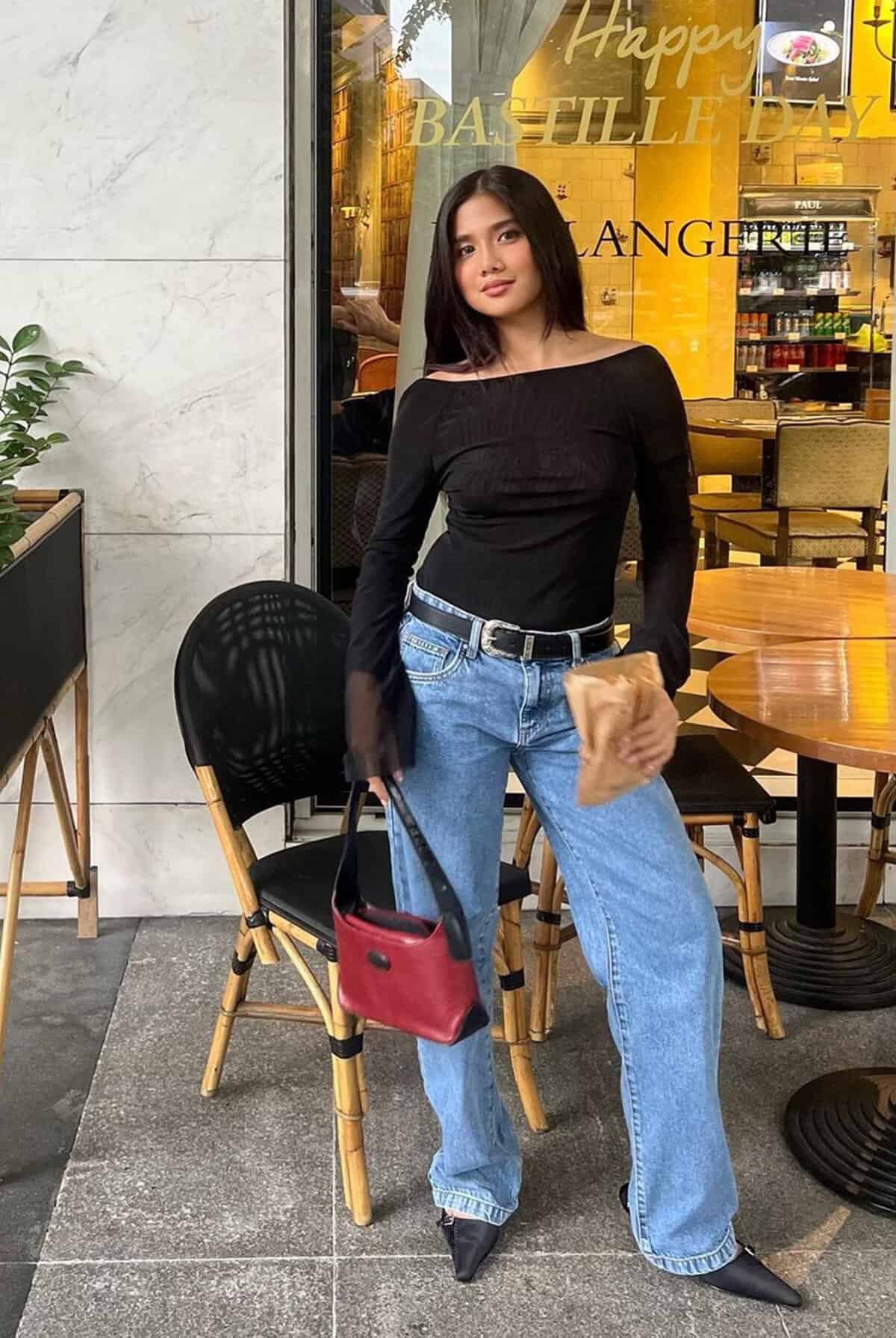 Elevate your campus style with this effortlessly cool combination of a sleek black off-shoulder top and relaxed wide-leg jeans. This outfit strikes the perfect balance between comfort and fashion-forward flair, ideal for long days of lectures and study sessions. The form-fitting top adds a touch of sophistication, while the loose-fitting denim keeps things casual and on-trend. Accessorize with a statement belt, pointed flats, and a pop of color with a red handbag to complete this versatile look. This ensemble is perfect for transitioning from class to coffee dates, embodying the essence of laid-back yet polished fall campus style.