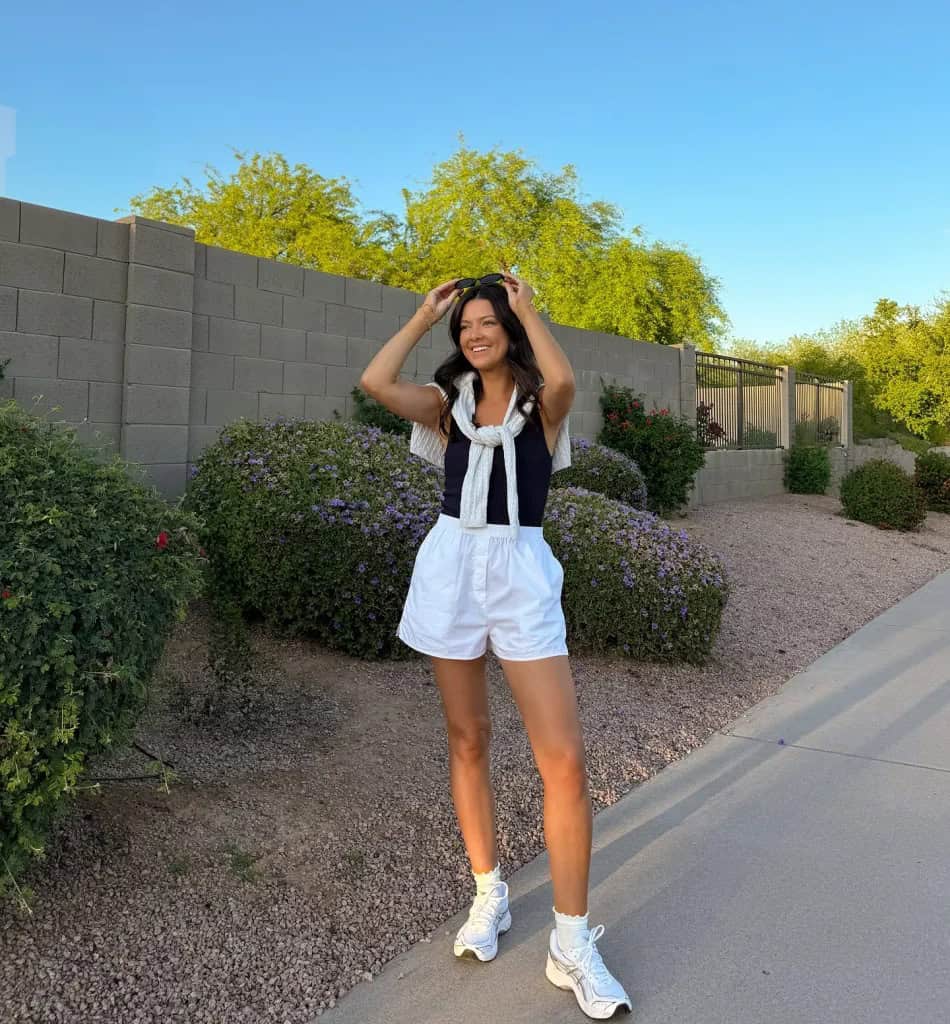 Embrace the crisp fall air with this effortlessly chic ensemble that’s perfect for navigating campus in style. The navy tank top paired with pristine white shorts creates a classic, preppy look that’s both comfortable and fashionable. The lightweight white cardigan tied around the shoulders adds a layer of warmth for those cooler autumn days, while also serving as a stylish accessory. Complete the outfit with trendy white sneakers, ideal for dashing between classes or lounging on the quad. This versatile combination strikes the perfect balance between casual and put-together, ensuring you’ll look your best whether you’re hitting the books or meeting friends for coffee after lectures.
