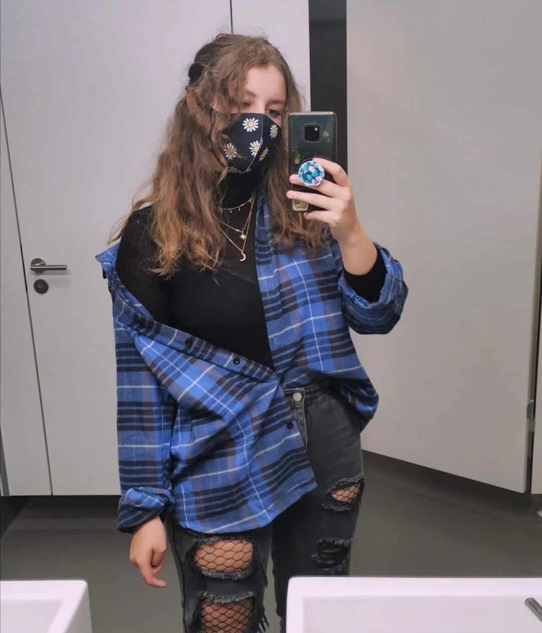 Embrace the perfect blend of comfort and edgy style with this grunge-inspired ensemble. The oversized blue plaid shirt adds a cozy layer for crisp fall days, while distressed black jeans with fishnet detailing bring a rebellious touch to the look. A simple black top underneath creates a sleek base, allowing the statement pieces to shine. Accessorize with layered gold necklaces for a touch of elegance, and don’t forget the trendy floral face mask for both style and safety. This outfit seamlessly combines classic fall elements with contemporary edge, making it ideal for navigating campus in true fashion-forward form.