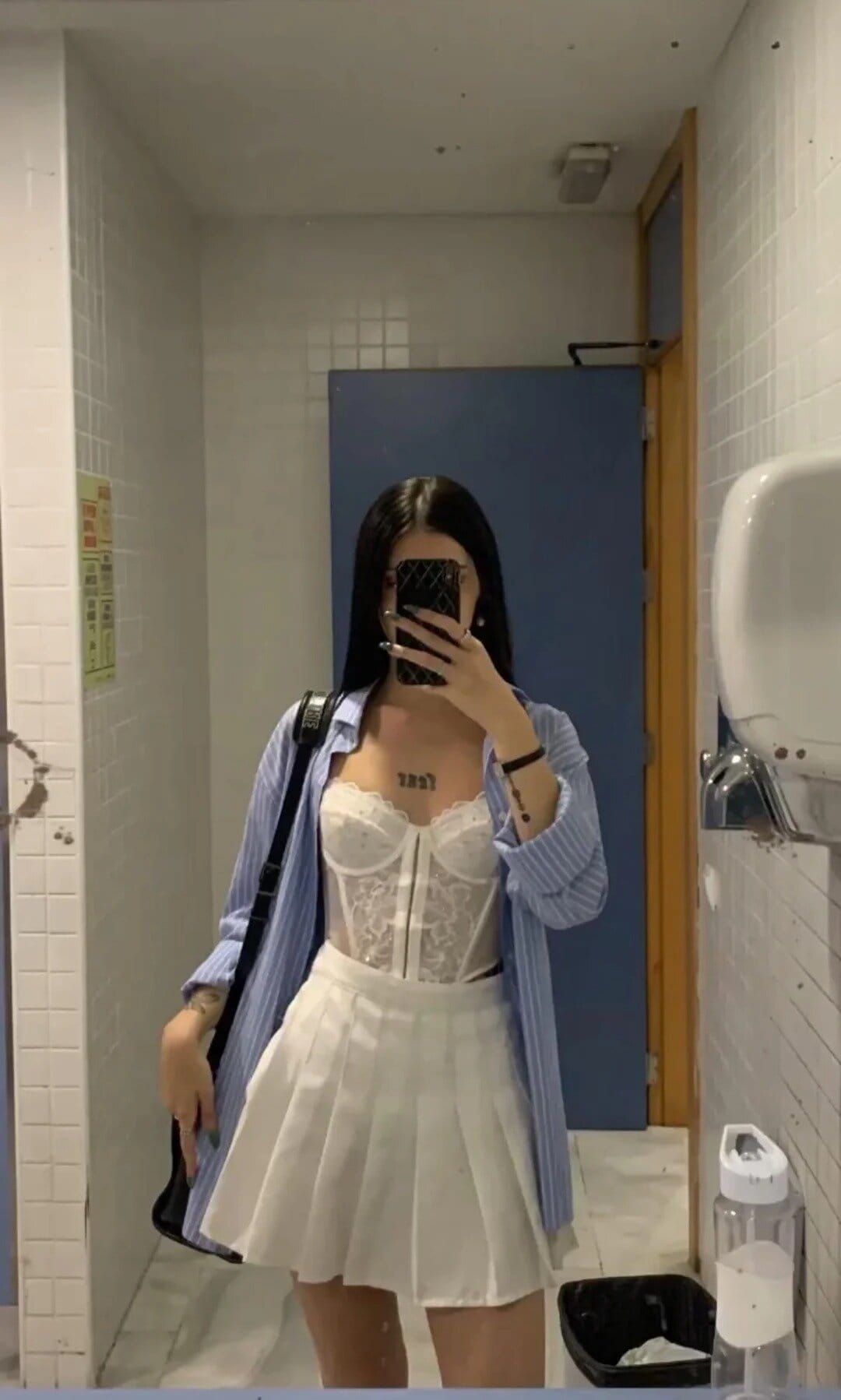 This outfit showcases a perfect blend of romantic and casual styles, ideal for crisp fall days on campus. The ensemble features a delicate white lace corset top paired with a pleated white skirt, creating a feminine base. Layered over this is a light blue striped button-down shirt, worn open as a lightweight jacket. This combination offers versatility for changing temperatures throughout the day. The look is completed with a black shoulder bag, adding a practical touch for carrying textbooks and essentials. This outfit demonstrates how to incorporate summer pieces into your fall wardrobe, making it a smart choice for transitional weather and a trendy option for fashion-forward students.