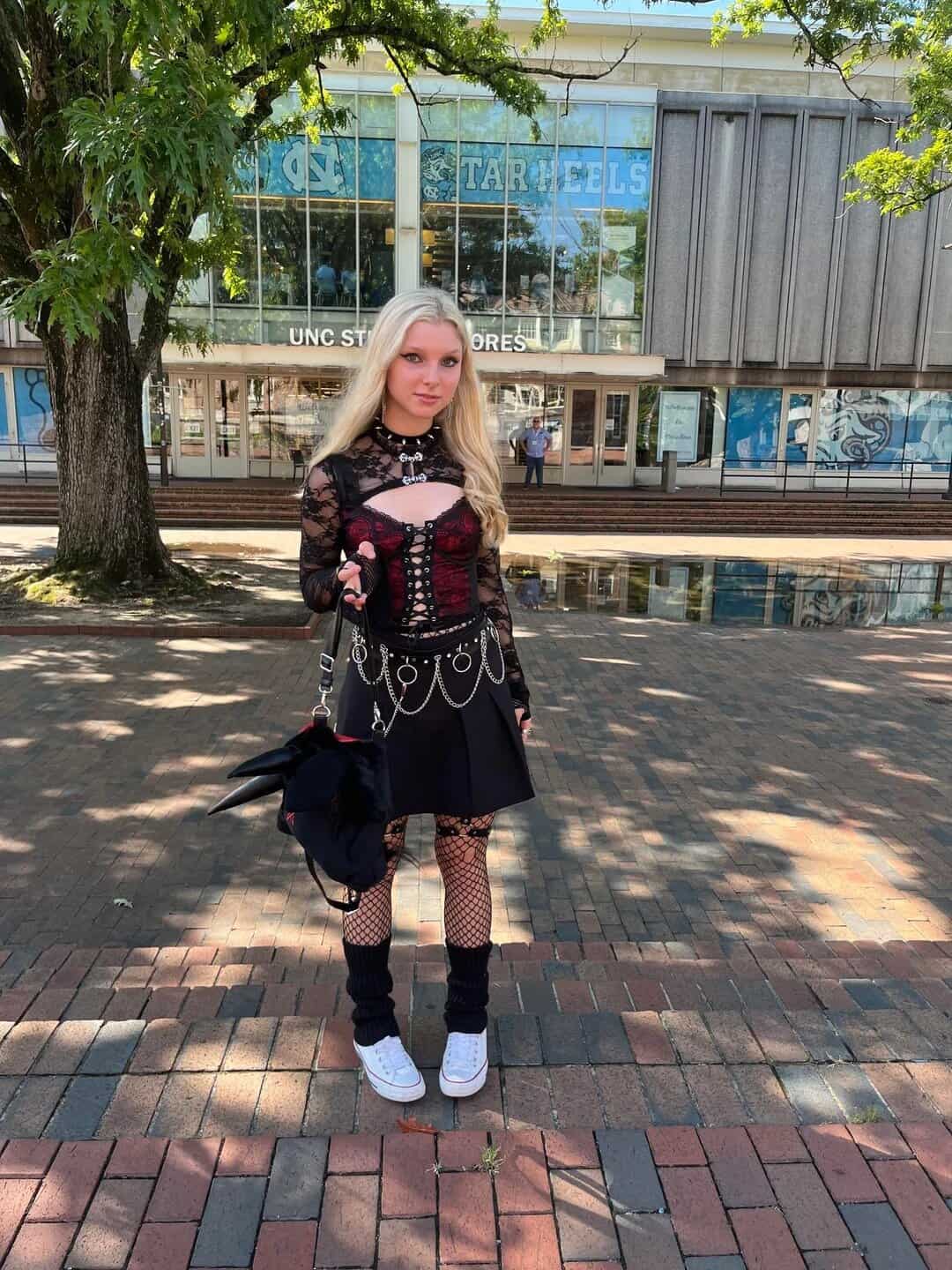 For those daring to make a bold statement on campus, this edgy goth-inspired ensemble is the perfect way to stand out from the crowd. The outfit combines a lace-detailed top with a cutout design, paired with a flared black skirt adorned with eye-catching chain accessories. Fishnet stockings and leg warmers add an extra layer of texture, while white sneakers provide a surprising contrast and ensure comfort for long days of lectures and campus activities. This look showcases how fall fashion can be both expressive and functional, allowing students to showcase their unique style while navigating university life with confidence.