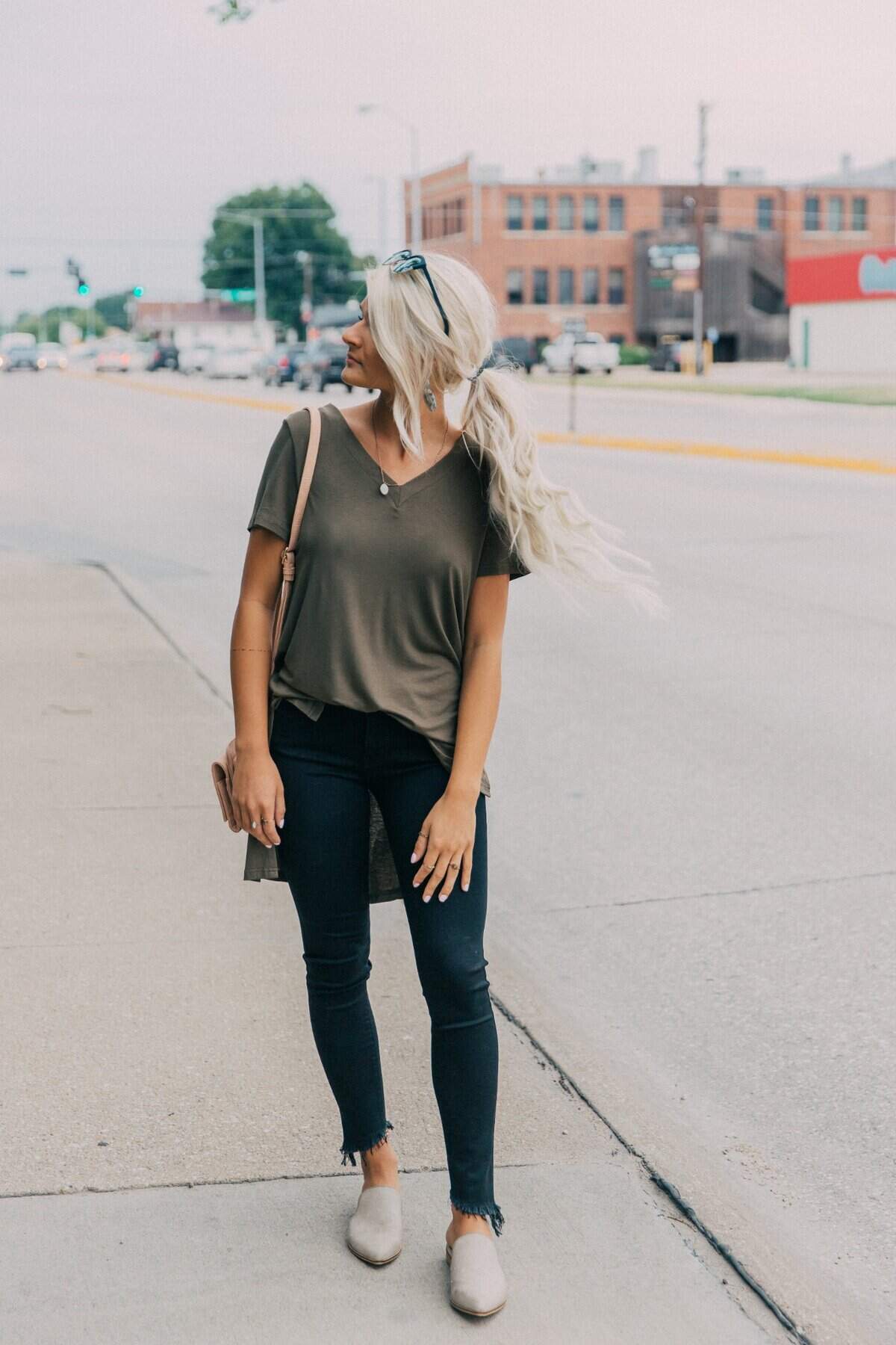 Embrace the essence of casual campus style with this effortlessly chic ensemble. The olive green V-neck tee serves as a versatile foundation, perfect for layering or wearing solo as temperatures fluctuate. Paired with sleek black skinny jeans and neutral slip-on shoes, this outfit strikes the ideal balance between comfort and style for long days of lectures and study sessions. The relaxed silhouette of the top allows for easy movement, while the fitted jeans create a polished look. Accessorize with a simple pendant necklace and a practical crossbody bag to keep your essentials close at hand. This outfit exemplifies how a few well-chosen basics can create a trendy, put-together look that’s ideal for navigating campus life in style.