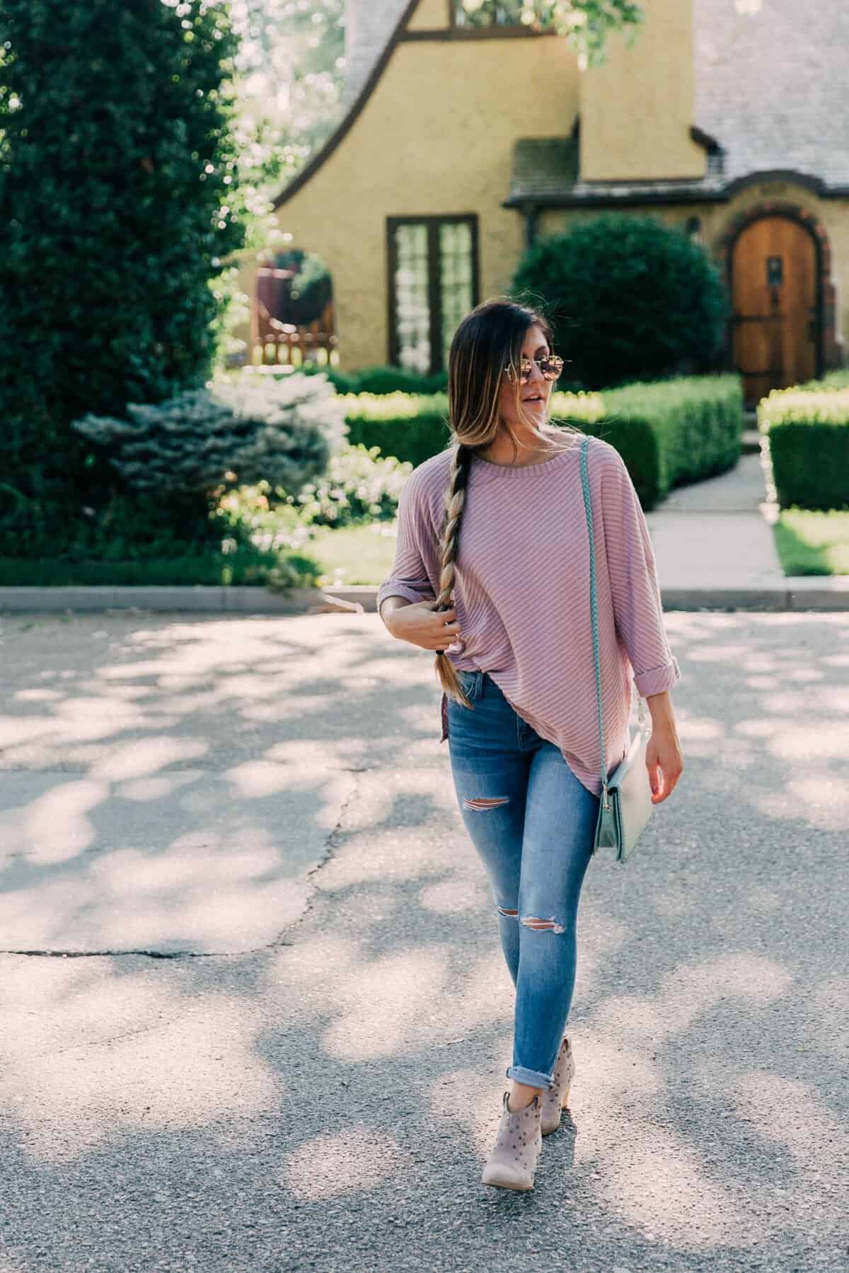 Embrace the crisp autumn air with this effortlessly stylish ensemble that perfectly balances comfort and fashion. The oversized pastel pink knit sweater is the star of this look, offering both warmth and a soft, feminine touch to your campus wardrobe. Paired with distressed skinny jeans and ankle boots, this outfit strikes the ideal balance between laid-back and put-together. The long side braid adds a playful, youthful element, while the mint crossbody bag provides a pop of complementary color. This look is perfect for those in-between fall days when you want to look polished for class without sacrificing comfort. It’s a versatile outfit that can easily transition from lectures to study sessions or casual hangouts with friends.