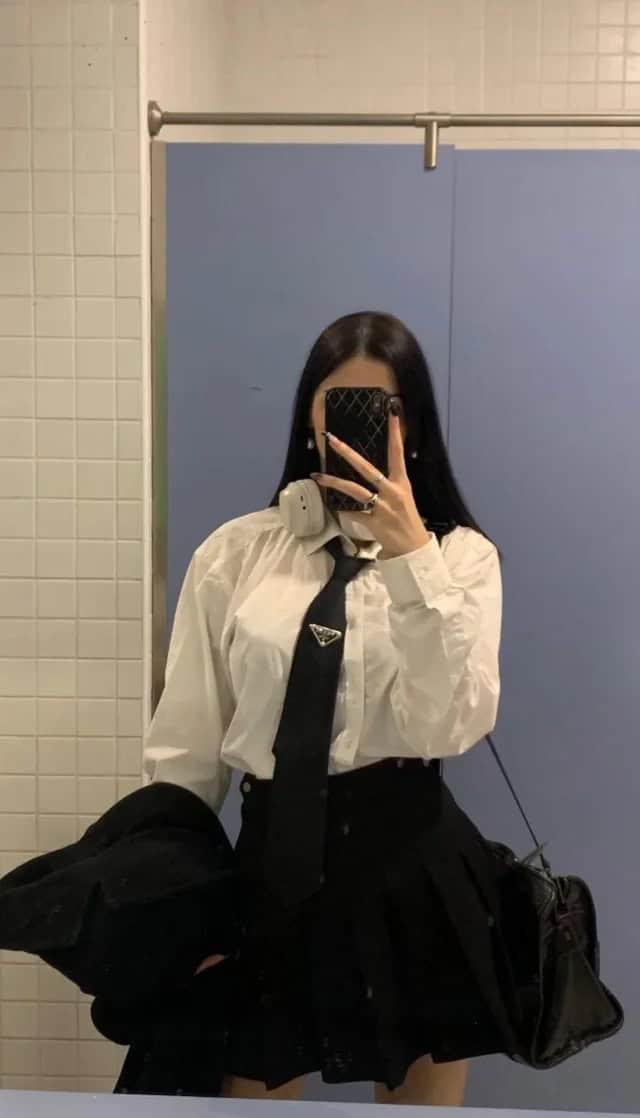 Elevate your campus style with this preppy-meets-chic ensemble that’s perfect for fall. The crisp white button-down shirt paired with a sleek black tie creates a sophisticated look that’s both academic and fashion-forward. The pleated black skirt adds a feminine touch while maintaining a polished appearance. This outfit strikes the perfect balance between professional and trendy, making it ideal for presentations, internships, or simply making a statement in lecture halls. Accessorize with a structured bag and minimal jewelry to complete this timeless yet contemporary look that’s sure to turn heads on campus.