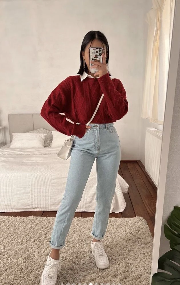 This outfit perfectly balances classic preppy style with modern trends, making it a standout choice for middle school hallways. The deep red cable-knit sweater layered over a crisp white collar adds a sophisticated touch, while the light wash mom jeans keep the look youthful and on-trend.
