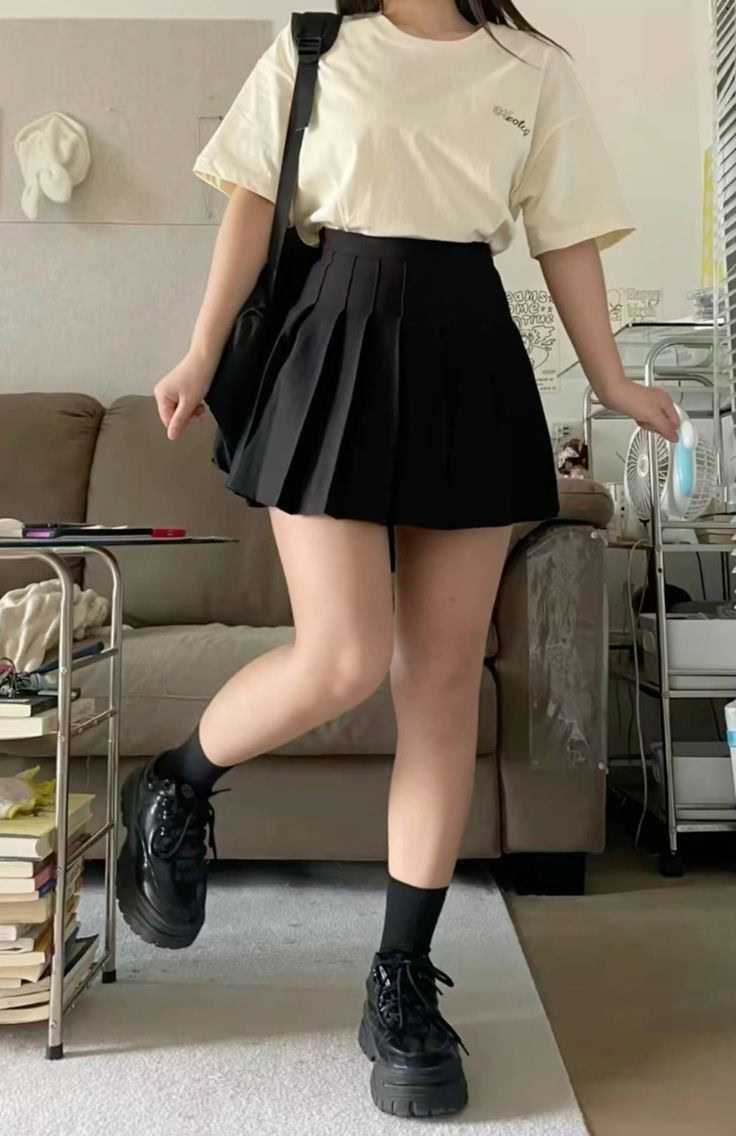 This trendy ensemble perfectly balances comfort and style, making it a standout choice for middle school fashion. The outfit combines a relaxed cream-colored t-shirt with a sleek black pleated skirt, creating a classic monochrome look thats both versatile and eye-catching.