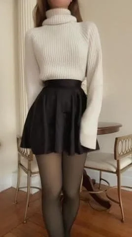 Elevate your school style with this sophisticated yet age-appropriate ensemble. The crisp white turtleneck sweater exudes cozy elegance, perfect for chilly hallways, while the flared black mini skirt adds a touch of playful charm.