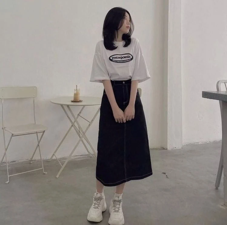 Elevate your middle school style with this trendy combination of a classic Patagonia logo tee and a chic black midi skirt. The oversized white t-shirt adds a casual, sporty vibe while the high-waisted denim skirt brings a touch of sophistication.