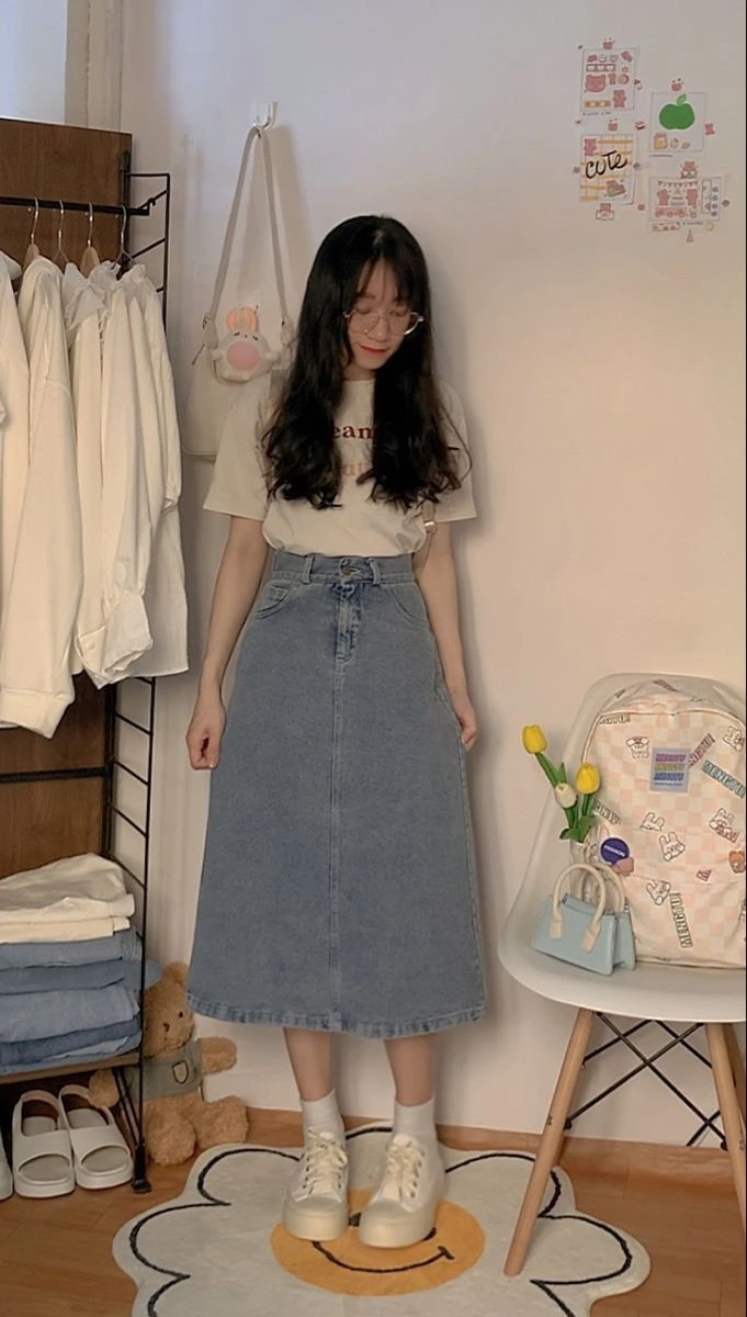 Step into the hallways with confidence in this trendy retro-inspired outfit. The high-waisted denim midi skirt paired with a simple white graphic tee creates a perfect balance of casual and cool.