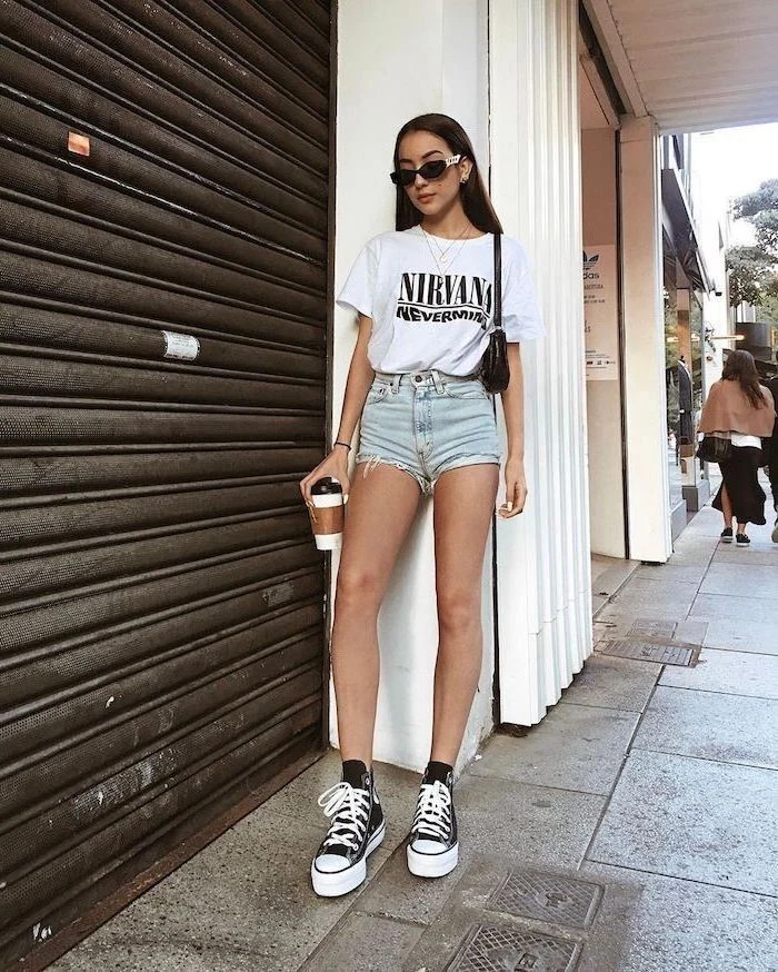 Channel your inner rock star with this effortlessly cool combo of a classic Nirvana t-shirt and light-wash denim shorts. This outfit screams 90s grunge revival, perfect for the trendy middle schooler looking to make a statement.