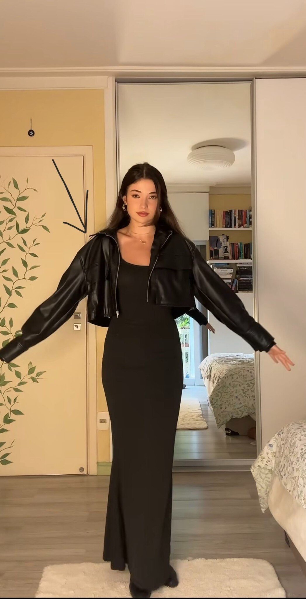 This sophisticated all-black ensemble is the ultimate winter bar outfit that exudes timeless elegance and confidence. The pairing of a sleek black leather cropped jacket with a fitted black maxi dress creates a striking silhouette that”s both modern and chic.