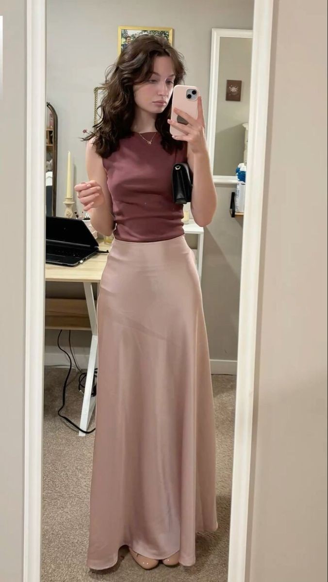 This sophisticated winter bar outfit perfectly balances elegance with understated glamour. The burgundy sleeveless top paired with a flowing blush maxi skirt creates a stunning color contrast that”s both timeless and on-trend for the season.