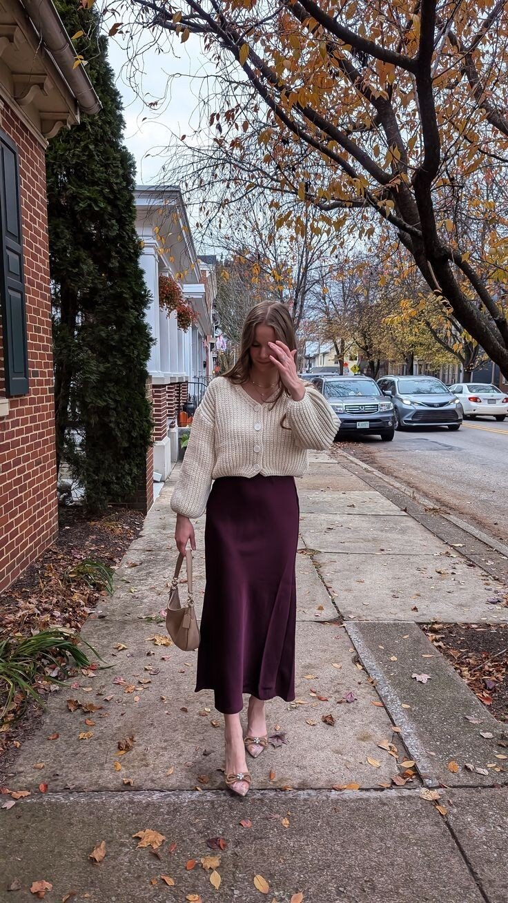 This timeless winter combination proves that elegance doesn”t require complexity. The soft cream cable-knit cardigan layered over a rich burgundy midi skirt creates a sophisticated silhouette perfect for upscale winter bars and social venues.