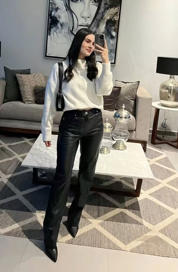This timeless combination proves that sophisticated elegance never goes out of style for winter bar outings. The creamy ivory sweater provides a soft, approachable contrast that balances the edgy appeal of black leather pants, creating an effortlessly chic silhouette perfect for turning heads.