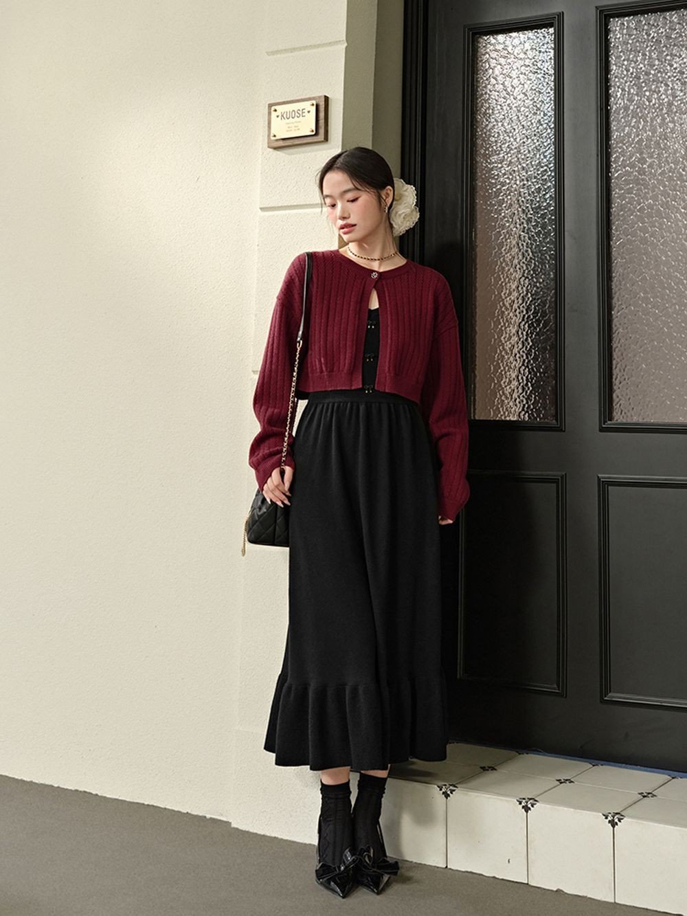 This sophisticated two-piece combination perfectly captures winter elegance for any bar outing. The rich burgundy cropped cardigan layered over a flowing black midi dress creates a striking color contrast that commands attention while maintaining refined sophistication.