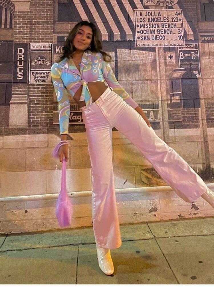 This outfit perfectly captures the bold, nostalgic energy that dominates winter bar scenes. The multicolored tie-front crop top featuring playful geometric patterns pairs effortlessly with soft pink wide-leg jeans, creating an eye-catching silhouette that balances trendy and timeless.